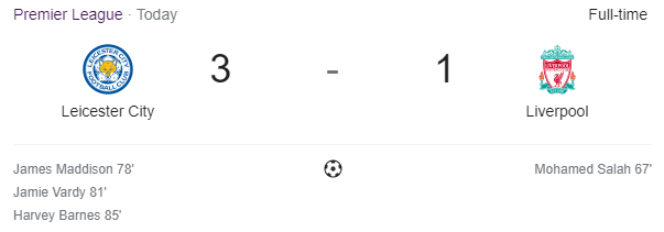 Allison must be suffering from PTSD because he does not seem to have recovered from his shocking performance against Manchester City. Today, he made another sad blunder that led to Leicester’s second goal two minutes after Maddison’s 79th minute goal. Though he denied Vardy from scoring a brace, he could not stop Barnes from making it three goals in six minutes. Klopp really needs to help him regain his confidence by resting him for the next few games before they find themselves competing with Arsenal for the EPL 10th place position because of his continued unforgiveable errors.
